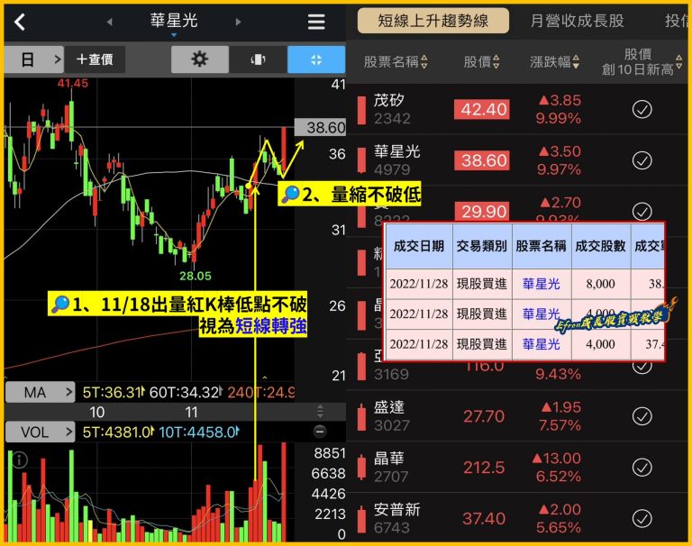 上週二(11/22)貼文就有提到,只要能站上38元以上就開始從當沖轉為短線操作,技術面來看11/18突破季線紅K棒低點不破,視為「波段轉強」,經過5個交易日量縮整理後,再次爆出新高量向上表態