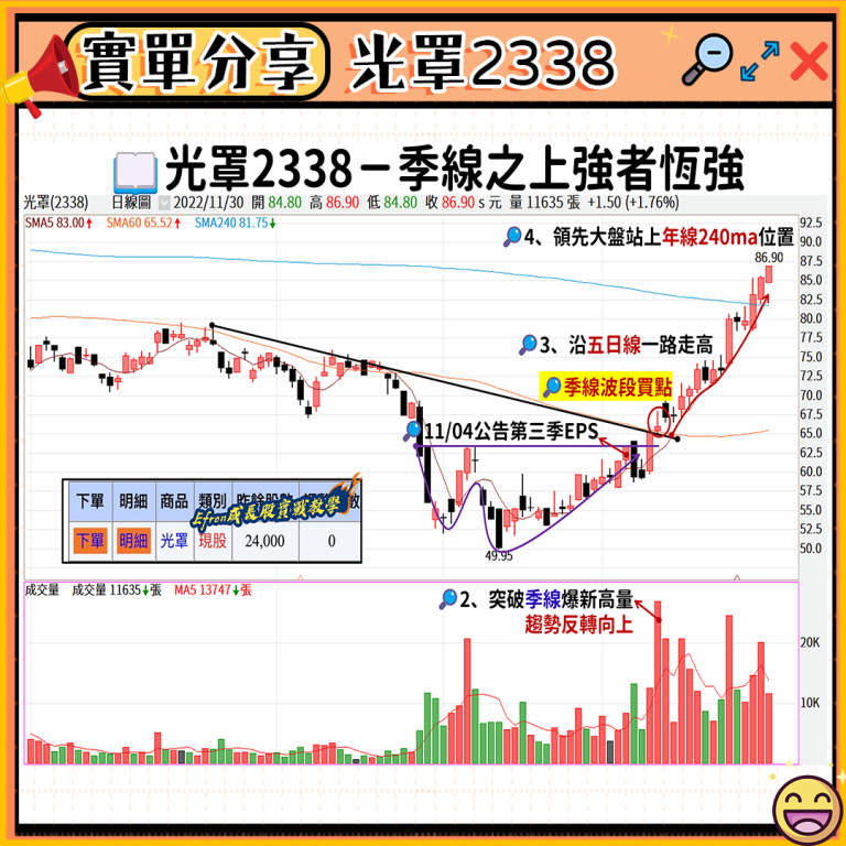 E大跟著季線生命線60ma分別在 78、73、66 逢低攤平三次