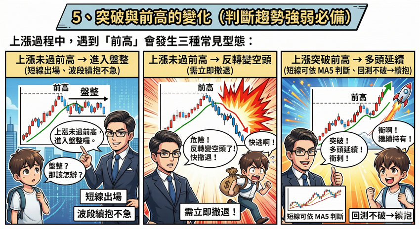 - 上漲突破前高 → 多頭延續 (短線可依 MA5 判斷、回測不破 → 續抱)
