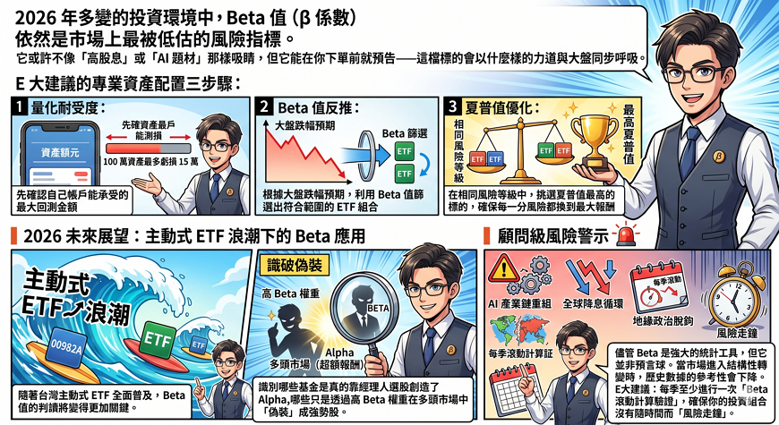 隨著台灣主動式 ETF(如 00982A 等)全面普及,Beta 值的判讀將變得更加關鍵。