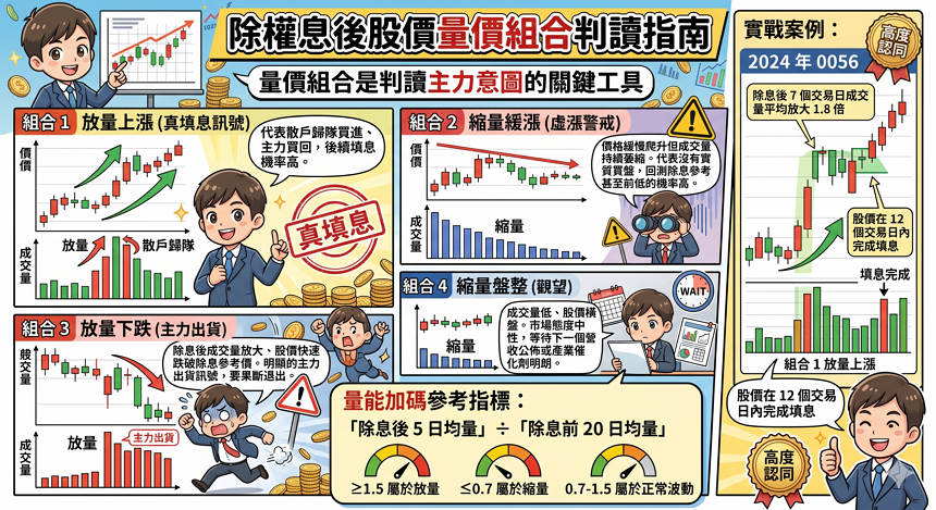 - 組合 1 放量上漲(真填息訊號):除息後 5-10 日內成交量放大、股價站穩參考價。代表散戶歸隊買進、主力買回,後續填息機率高。