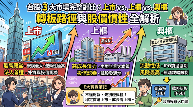 E大實戰筆記: 簡單口訣:穩定首選上市、成長中型看上櫃、新興題材在興櫃但風險最高。如果你連財報都還看不懂,建議先別碰興櫃,那裡的議價空間(買賣價差)有時大到讓你一買就虧 5%。