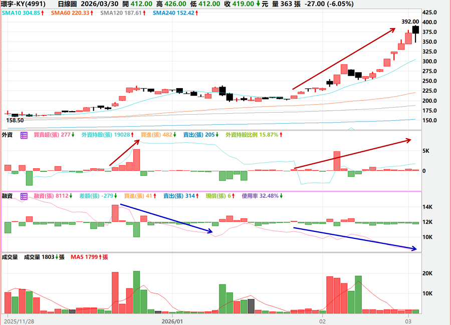 但外資與投信卻開始連續賣超。更可怕的是,融資餘額在短短幾天內呈現近乎垂直的飆升。