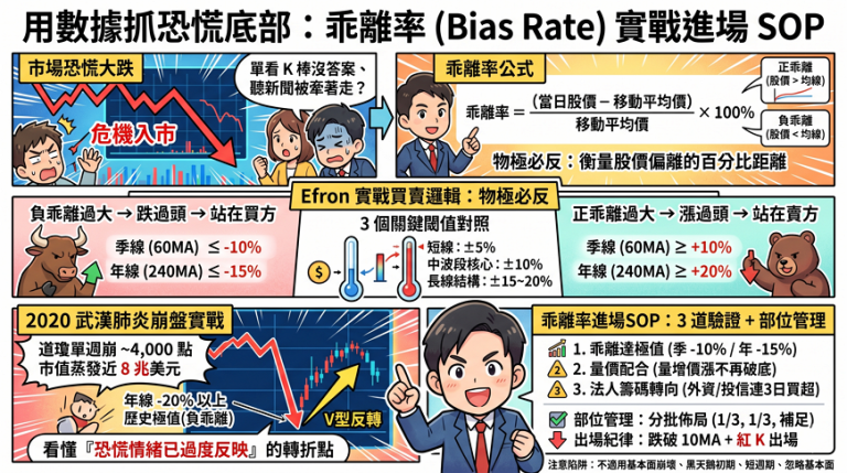 本文用 乖離率(Bias Rate)這個物極必反指標,從公式定義、正負乖離邏輯、Efron 實戰買賣訊號標準、到 2020 年武漢肺炎崩盤的負乖離買進案例,完整還原「用數據抓恐慌底部」的進場 SOP。