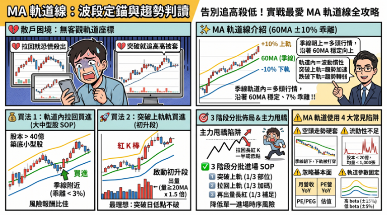 本文介紹的MA 軌道線(季線 60MA ±10% 乖離)是 E 大實戰最常用的「波段定錨工具」——把乖離率視覺化成上下軌道,