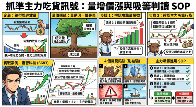 - 陷阱 4:個股流動性不足—— 中小型股單日「爆量」可能只是 1 個大戶進場,不代表機構吸籌。需確認 20 日均量 > 5,000 張