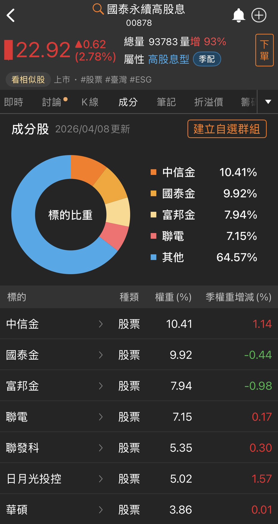 00878:特色在於加入 ESG 篩選,且金融股比例較高,抗震性強,適合穩健型存股族。