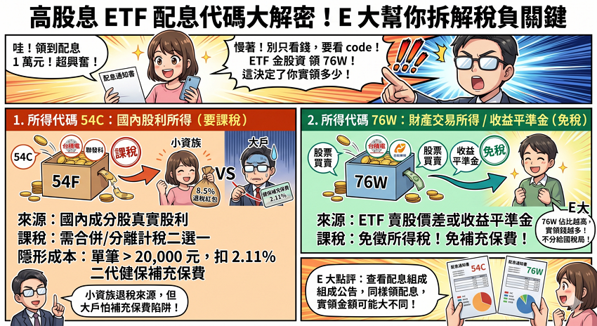 許多投資人看到高股息 ETF 配息很興奮,卻忘了看配息通知書上的「所得代碼」。並非每一塊領到的配息都要課稅。E大 幫你拆解這兩個決定你稅負高低的關鍵代碼: