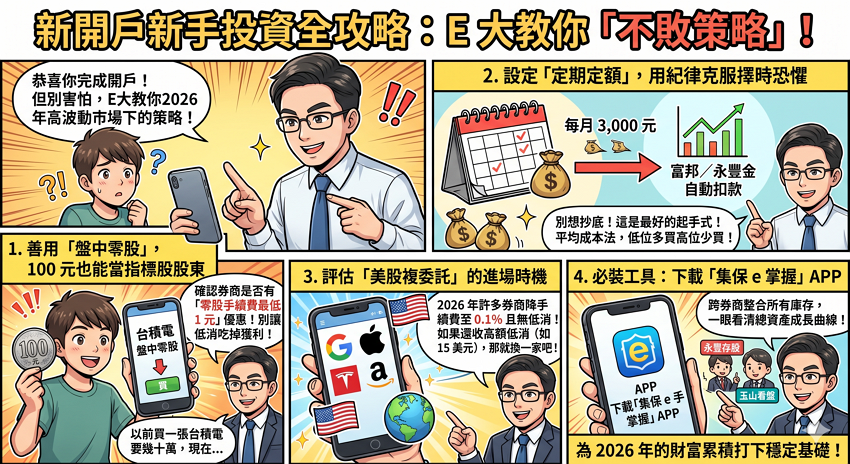 恭喜你完成了開戶!但 E 大 發現,很多新手在拿到帳號後,反而因為害怕「買在高點」或不熟悉操作而遲遲不敢出手。在 2026 年高波動的市場環境下,你的第一筆交易建議遵循以下「不敗策略」: